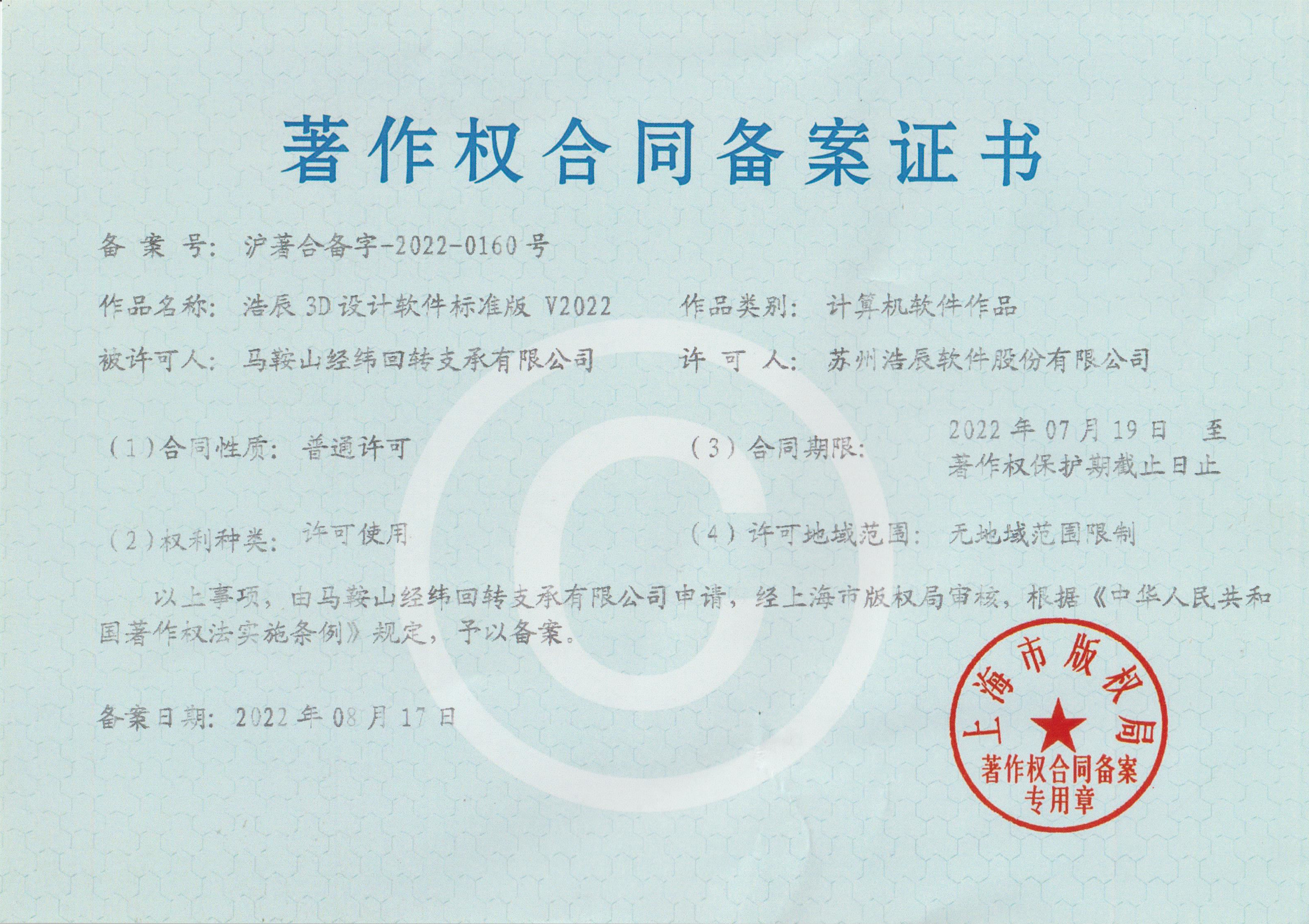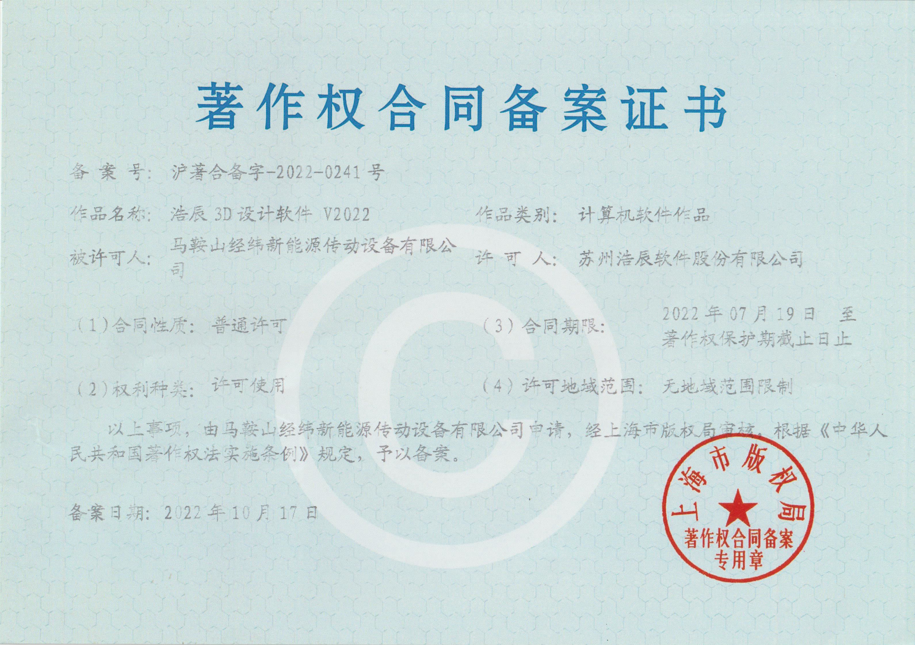 • 浩辰3D設計軟件V2022著作權合同備案證書