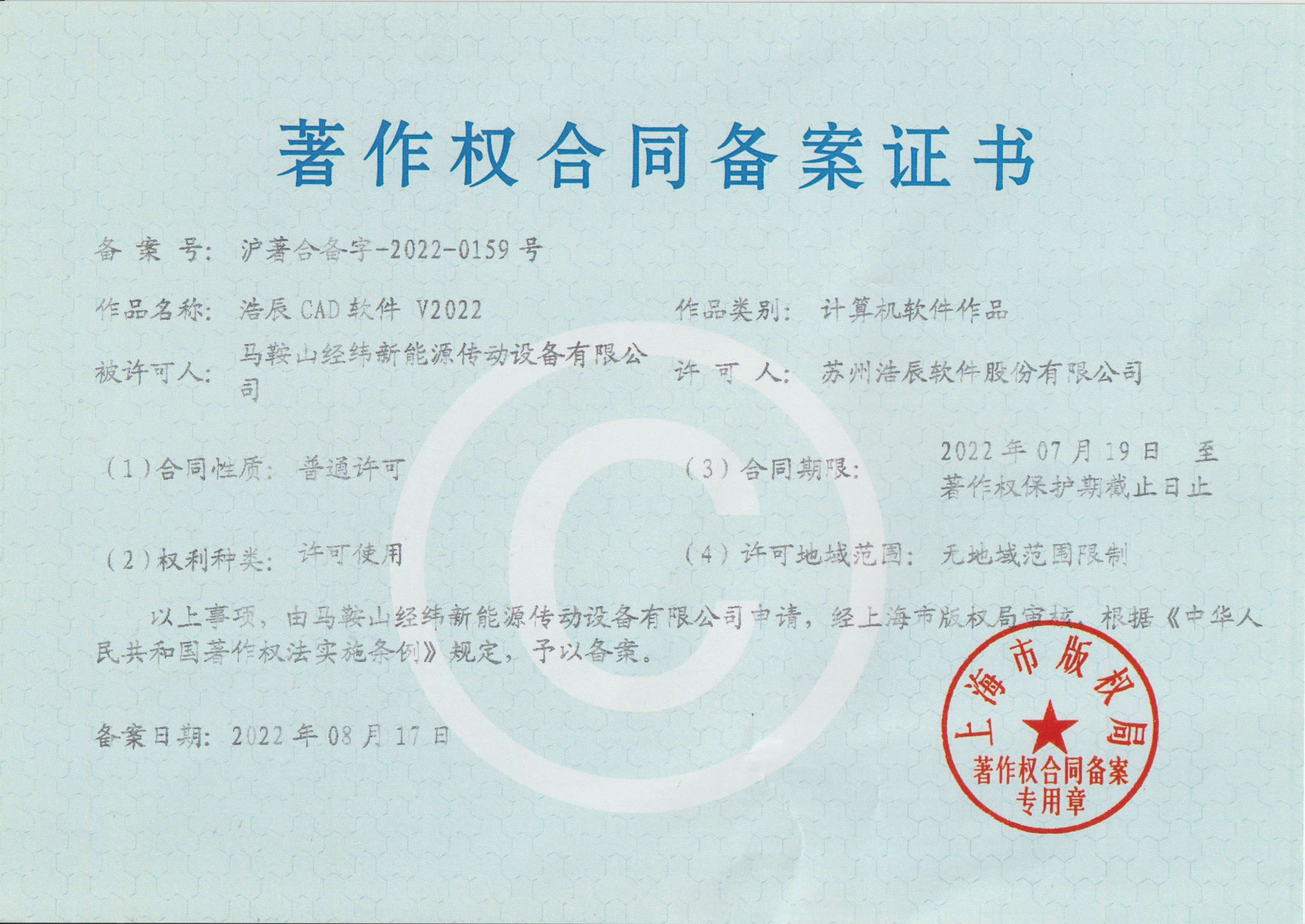 • 浩辰CAD軟件V2022著作權合同備案證書